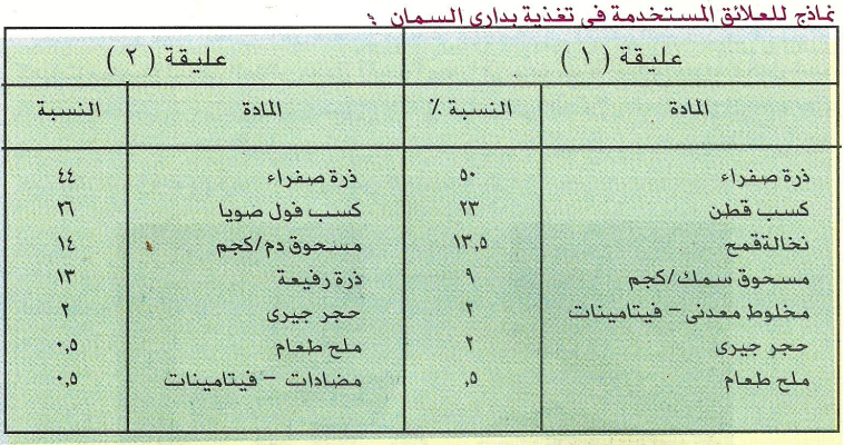 وهناك عليقة خاصة بتربية بداري السمان لانتاج اللحم وهي: