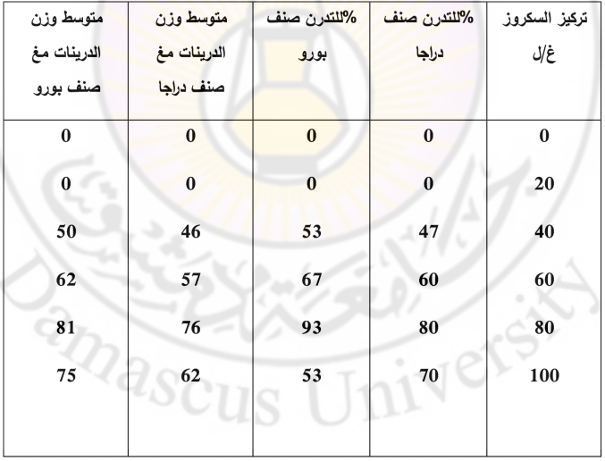 ففي تجربة نفذت على تكوين الدرينات الدقيقة في صنفين من البطاطا الدراجا والبورو. أخذت نتائج التدرن بعد 60 يوما من زراعة العقل المفردة على وسط التدرن المضاف له تراكيز مختلفة من السكروز (0-20-40-60-80 و 100 غ/ل)، تحت ظروف النهار القصير، جمعت العينات وحسبت النسبة المئوية للتدرن ومتوسط وزن الدرينات المتكونة، كما هو موضح بالجدول التالي:
