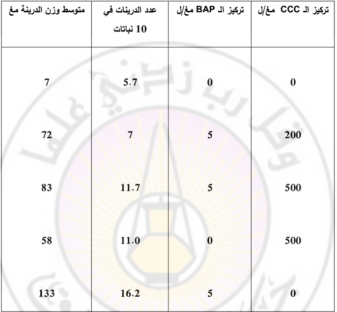 من الجدول يتبين لنا بأن إضافة السيتوكينين لوحده يحسن تكوين الدرينات كما إضافة ال CCC لوحده زاد في نسبة الدرينات الدقيقة المتكونة بالنسج كما زاد في وزن الدرينات المتكونة، اما إضافة السيتوكينين مع ال CCC قد زاد بشكل كبير نسبة الدرينات المتكونة وفي متوسط وزنها.