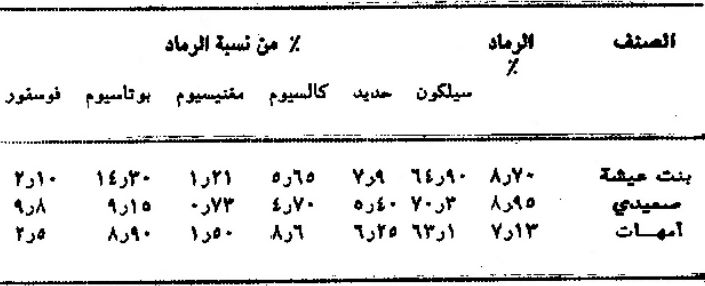 جدول يبين محتويات العناصر المعدنية في سعف النخيل