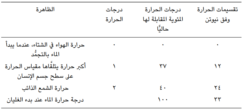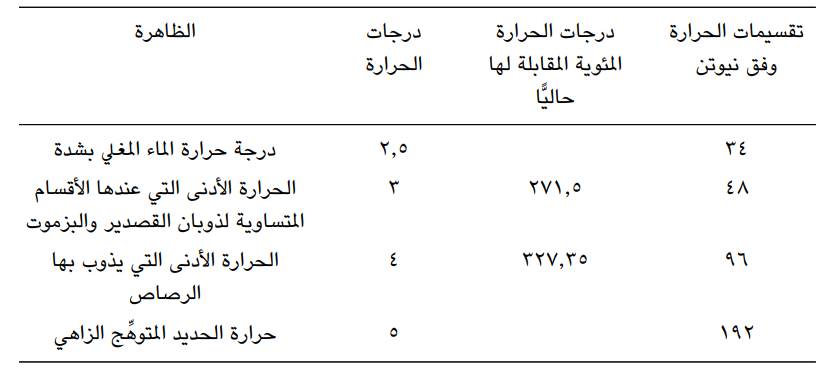 جزء من جدول تجريبي حسابي لمقياس نيوتن للحرارة الذي حاول أن يجعل منه معيارًا ليعمل عليه الآخرون. وقد علق الفيزيائي الفرنسي جان بابتيست بيو J. B. Biot (1774-1862م) على عمل نيوتن هذا بأنه يحوي على ثلاثة اكتشافات مهمة؛ (1) طريقة لصنع مقياس حرارة قابل للمقارنة من خلال تحديد المصطلحات القصوى لتدرجها من ظواهر ذات درجة حرارة ثابتة. (2) تحديد قانون التبريد في الأجسام الصلبة عند درجات الحرارة المعتدلة. (3) مراقبة ثبات درجة الحرارة في الانصهار والغليان*