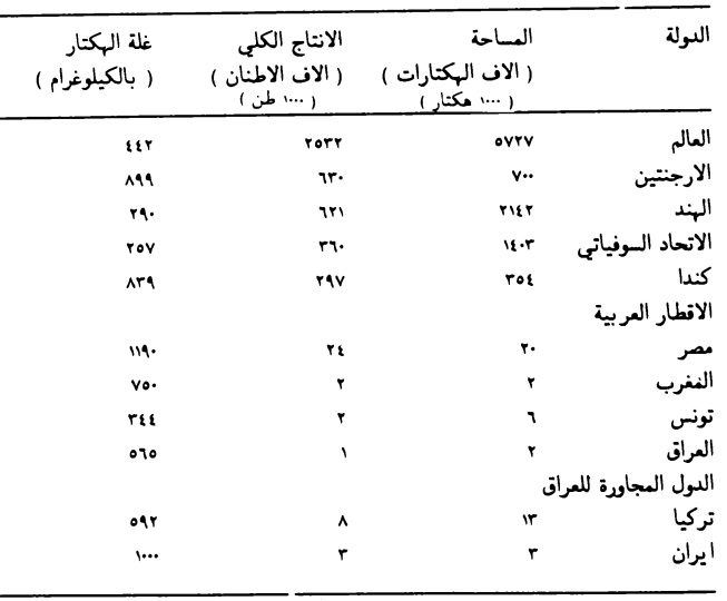 جدول يبين المساحات والانتاج الكلي وغلة الهكتار من كتان البذور للعالم وللدول العالمية المشهورة بإنتاجه وكذلك الاقطار العربية والدول المجاورة للعراق لسنة 1976 (F.A.0.1976)