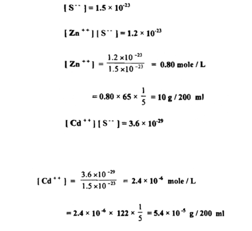 كم عدد جرامات ++Zn وعدد جرامات ++Cd التي يمكن أن يبقي ذائباً في 200 H2S مل من محلول HCl+H2S علماً بأن تركيز الكبريتيد هوX10-231.5 وأن حاصل إذابة