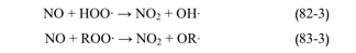 أهم تفاعلات أكسدة أول أوكسيد النيتروجين عمليا في الغلا مع . تفاعله جذر بيروكسي آلكيل والجذور الهيدروبيروكسيلية حرة، التي تعـــد أحـــد المراحل الأساسية في تفاعلات الضباب الدخاني Smoge وف تدرس لاحقاً بالتفصيل :