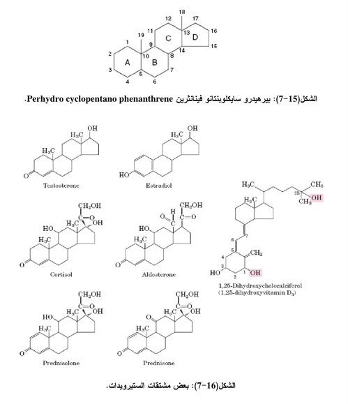 الستيرويدات هي مركبات مشتقة من النواة الأساسية المسماة بير هيدرو سايكلوبنتانو فينــــانثرين Perhydro cyclopentano phenanthrene التي هي عبارة عن مجموعة حلقات هيدروكاربونيــة (الشكل 15-7). والتي توجد بشكل حر أو متحد بالأحماض الدهنية على شكل إسترات وتشمل مركبات مختلفة (الشكل 16-7) يمكن تصنيفها إلى: