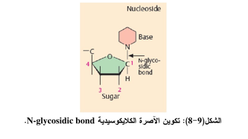 تتكون النيوكليوسيدات بصورة عامة من قاعدة بيورينية او بريمدينية مرتبطة مع السكر الخماسي (الرايبوز أو الديوكسي رايبوز) وذلك من خلال أصرة كلايكوسيدية Glycosidic linkage من نوع بيتــا ( β) (إذا كانت مجموعة الهيدروكسيل المتصلة بالكاربون للسكر إلى الأعلى وهو ارتباط بين ذرة كاربون رقم واحد للسكر مع ذرة النيتروجين في الموقع رقم 9 للبيورين او مع ذرة النيتروجين في الموقع رقم واحد للبيريميدين (الشكل 9-8 ) وهناك نوعان من النيوكليوسيدات هما :