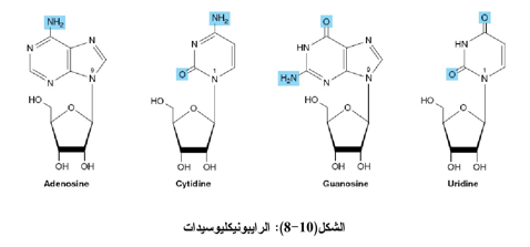 1- النيوكليوسيدات الرايبوزية Ribonucleoside إن القواعد النيتروجينية التي تحتوي علـــى ســـكر الرايبوز مثل الأدنين تسمى أدينوسين Adenosine والسايتوسين الحاوي على رايبوز يسمى سايتدين Cytidine وكذلك الكوانسين Guanosine واليوردين Uridine (الشكل 10-8).