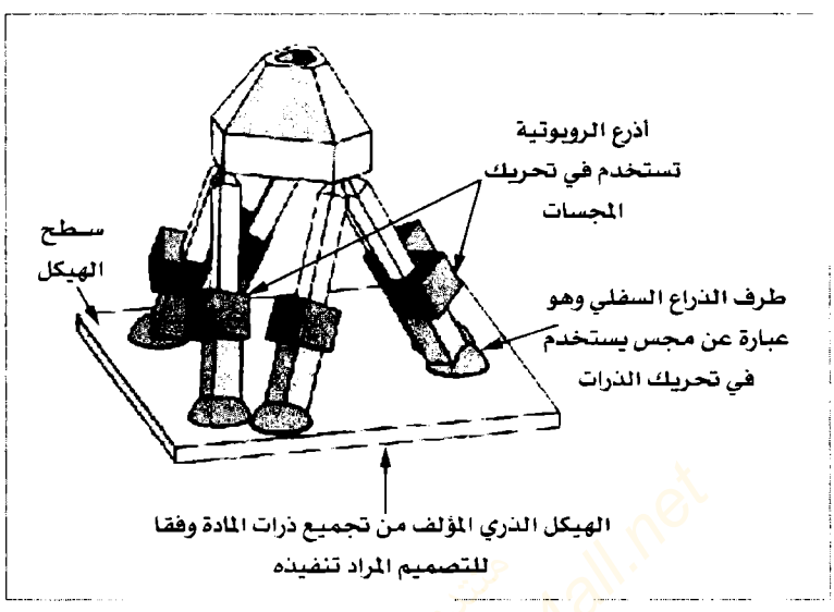الشكل (6 – 12) تصميم مُبسط قام به دريكسلر (27) ليوضح فكرته في إنتاج أجهزة ضخمة روبوتية الأذرع لها القدرة على تحريك ثلاثة ملايين من الذرات وترتيبها وفقا لنموذج الهيكل المراد تنفيذه (أضاف مؤلف هذا الكتاب الشرح على الشكل الأصلي الموجود في المرجع الرقم 27).