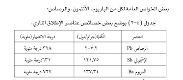 يظهر – في الغالب – عند تحليل مخلفات الاطلاق الناري عناصر لكل من : الرصاص والباريوم والانتمون Pb,Ba,Sb كما يمكن أن يظهر في عينات أخرى عناصر مثل Zn ,Ti ,St وذلك حسب تكوين المادة البادئة في الطلقة النارية والتي تختلف من طلقة الى أخرى ومن سلاح الى آخر ويوضح الجدول ( 4-2)