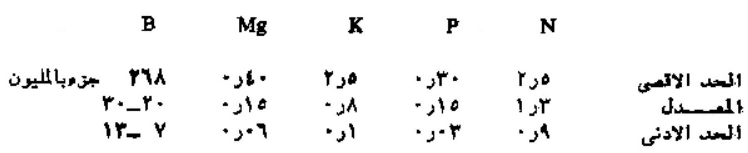 جدول يبين معدل العناصر الكيميائية في اوراق الزيتون على أساس الوزن الجاف