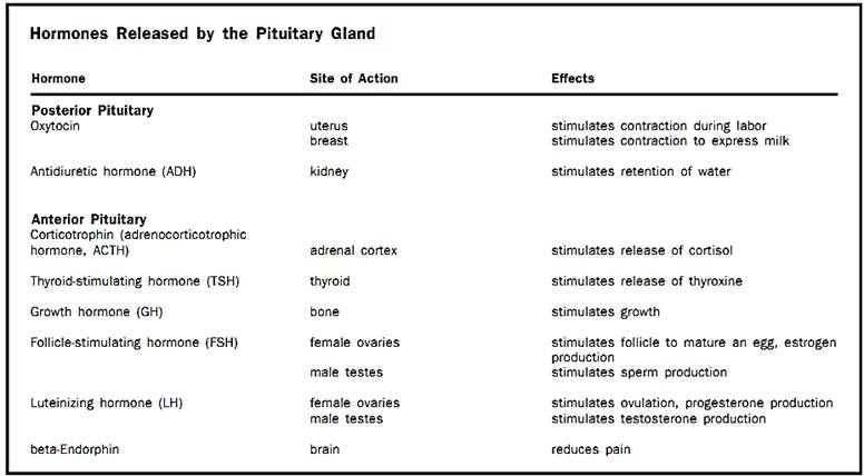 The pituitary gland is one of the principal glands of the endocrine system. It releases at least nine hormones affecting a wide variety of body functions, including growth, reproduction, and levels of electrolytes and water in the body fluids. The pituitary sits near the center of the head, behind the nose and beneath the brain, just below the hypothalamus. The hypothalamus is a brain structure from which the pituitary receives chemical signals that control its action. Nerve endings from the hypothalamus stimulate the posterior portion of the pituitary to secrete oxytocin and antidiuretic hormone (ADH). Capillaries from the hypothalamus carry releasing factors and inhibiting factors to the anterior portion of the pituitary, stimulating or inhibiting release of eight other hormones (see Table 1). All the hormones of the pituitary gland are peptides, small chains of amino acids.