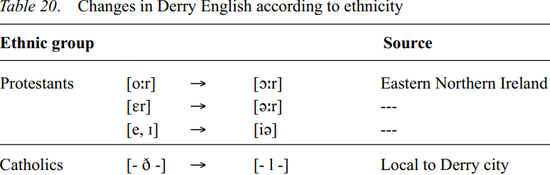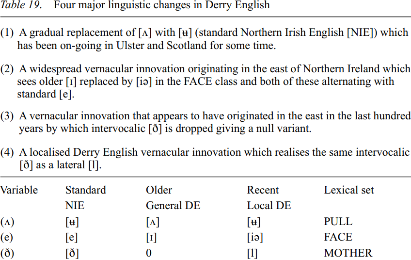 The only research on the English of Derry city is that of M-Cafferty, apart from one study of intonation in Derry. The city has a special status within Northern Ireland as it is on the one hand the second largest and on the other the only major city with a Catholic majority. It is understandable that it would receive innovations which arise in Belfast but also that the Catholic majority in the city might well show an inherent resistance to these. A number of changes are recorded for Derry which are listed in the following.