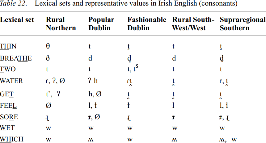 Wells’ lexical sets were designed to deal with the vowel distinctions found in Received Pronunciation. They do not handle consonants. For that reason new sets are necessary for the current discussion. A number of key words have been chosen and the consonant which is at issue in each case is underlined as can be seen from Table 22