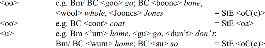 -type vowels at least in forms of the verb go (e.g. Bm <goo/a-gooin’/gu/gin’/guz> ), as well as <’um/um> home, <wunnarf> won’t half, <dun’t> don’t. Chinn and Thorne (2001: 160) claim that the feature also occurs in home in Worcestershire and Black Country, although in the latter case <wum> is said to be more frequent.