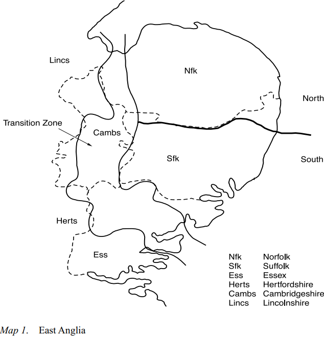 Within the core area of East Anglia, the biggest regional differentiation phonologically is between the north and the south. As indicated in Map 1, the northern area includes Norfolk, with the exception of some of the Fens, as well as the northeastern part of Suffolk as far south, approximately, as Southwold. The southern area includes the rest of Suffolk, and those areas of northeastern Essex which are still East Anglian-speaking. King’s Lynn, Norwich, Yarmouth and Lowestoft are thus in the northern area, Ipswich and Colchester in the southern.