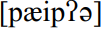 Intervocalic and word-final /p, k/ are most usually glottalised. This is most noticeable in intervocalic position where there is simultaneous oral and glottal closure, with the oral closure then being released inaudibly prior to the audible release of the glottal closure, thus paper
