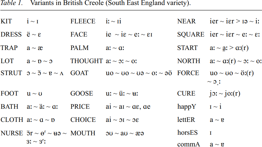 Table 1 summarizes the principal vowel variants; the general effect is a London like system with a variably Jamaican-like sound. It is difficult, in the present state of knowledge, to make quantitative statements about preference, and it cannot be asserted (without premature idealization) that all variants even belong to the same system, given such factors as variable rhoticity, vowel quality dispersion and overlap, alternation of centring glides with monophthongs with upglides in the same word-class, etc. Nevertheless, all variants may be encountered in the speech of Caribbean-origin Britons who claim to be using ‘Patwa’ or ‘Creole’.