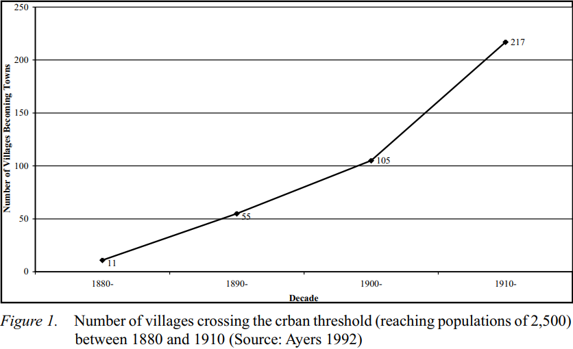 General stores not only played an essential role in the post-bellum Southern economy, but they also formed the nucleus of an emerging urban system in the South. Because stores also supplied furnishings for an increasingly less self-sufficient farm population, loose clusterings of houses frequently grew up near them. With the construction of cotton gins, churches, schools, and railroads, these loose clusters often grew into the villages (settled places with populations under 2,500) that began to dot the Southern countryside after 1880. Some of these further evolved into towns (settled places with populations greater than 2,500 – the U. S. Census Bureau’s definition of an urban area) and thus formed the first phase of urbanization in the South. The growth in the number of villages and towns was as stunning as the growth in the number of stores was: “the number of villages doubled between 1870 and 1880 and then doubled again by 1900 (Ayers 1992: 20). Literally “thousands of villages came into existence during the last quarter of the 19th century, and (as figure 1 shows), hundreds more passed over the line into official ‘urban’ status …” (Ayers 1992:55).