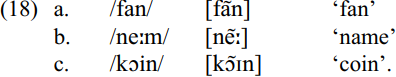 JamE does not allow the variable deletion of a nasal consonant, leaving nasalization of the preceding vowel as the only evidence of its presence underlyingly. Thus, JamE [sõm] ‘some’, unlike its JamC cognate, can never be realized as * [sõ] ‘some’. In addition, the attested role of phonemic vowel nasalization JamC is absent in JamE. In JamC, there are items lexically specified to have a nasalized vowel with no following nasal consonant. In JamE, no such items exist. Below are the JamE cognates of the JamC items with lexically specified nasalized vowels. As can be seen, they both occur in JamE with an /nt/ sequence in the coda.