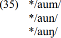 Nasal consonants may not appear in the coda when the nucleus consists of the diphthong /au/. The sequences so blocked are presented below.