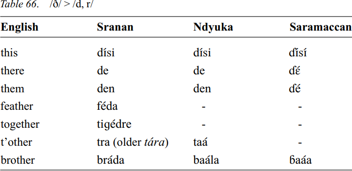 There are not very many examples of items with English /ð/. In a number of them a development to /d/ is observable. The item t’ other shows a development /ð/ to /r/. However this is parallelled in this word by forms in other creoles such as Jamaican /tára/ and Gullah