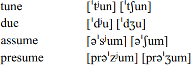 AusE shares with a number of other English dialects a possible realization of /t, d, s, z/ preceding the GOOSE vowel [u] either as the as [tj, dj, sj, zj] or the corresponding palatals /ʧ, ʤ, ʃ, Ʒ/. Thus the following variants regularly occur:
