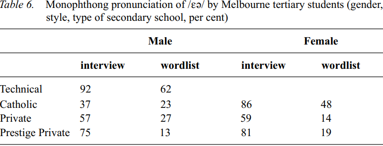 Monophthongal forms of SQUARE and CLOTH words are by contrast extremely frequent throughout Australia, with environmental constraints; a following consonant within the word favors a monophthong, parallel to NEAR and CURE. Conversely, strong stress and final position permit a virtually disyllabic realization, [ɪjз] for NEAR, [(j)ʊwз] for CURE, [εjз] for SQUARE, and [ɔwз] for CLOTH words without final consonant such as paw or pore (or for that matter poor; in Australian English many CURE words without a preceding /j/ glide have merged into the CLOTH class, and even those with the glide also vary between [jʊwз] and [jɔ] realizations). Table 6 (Bradley and Bradley 1979: 78) shows the pattern of monophthongisation for the NEAR vowel in Melbourne among tertiary-age students, favoring the offglide in isolation and also showing differences between speakers based on the type of secondary school attended, reflecting social differences. In the sample, there were no female students who had attended technical secondary schools.