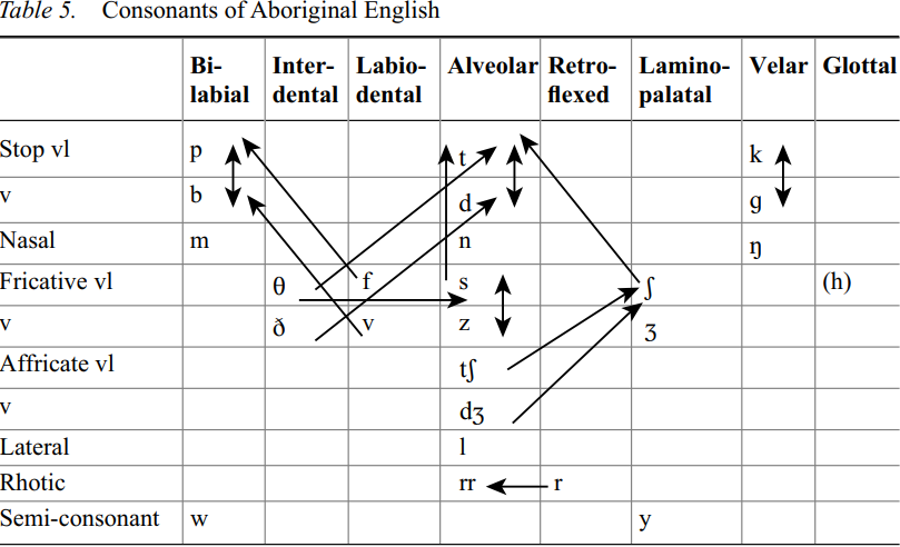 The inventory of consonants in Aboriginal English, and their distribution, show the influence of the pidgin/creole history of the dialect, although historic records show that many of the phonetic modifications which took place in the early stages of pidginization are no longer operating (Malcolm and Koscielecki 1997: 59). Table 5 represents the consonants of Aboriginal English, showing some of the common substitutions which take place: