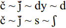 There is a good deal of variation across individual speakers’ phoneme inventories, and as a result the decisions on inclusion and exclusion of phonemes in the above inventory are to some degree arbitrary. Not all speakers make use of the same set of distinctive features in their phoneme inventories, so that certain consonants will be conflated along different lines for different speakers. The voicing distinction is not always clear-cut, but both voiced and voiceless stops are included in the inventory as proposed above. For the alveolar fricative and the palatal affricate, however, we do not consider this distinction to be a phonemic one for most speakers. In reality, [č] alternates with [ǰ], which in turn alternate with [dy] and [d] in speakers who do not have palatal affricates. The palatal affricate may also be replaced with a fricative. The place of articulation of the fricative varies between alveolar [s] and palatal [ʃ].