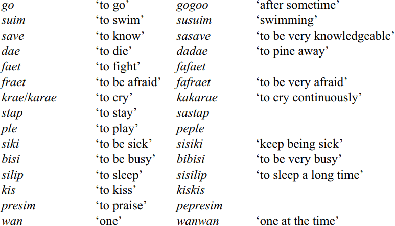 Pijin makes room for reduplication as a productive pattern in the morphology of (primarily) verbs, where it can function to modify meaning or mood. It is also present in the substrate languages of the Solomon Islands, such that it remains to be seen whether the morphophonemic rules also correspond to those of the vernaculars. Reduplication may involve either full or partial reduplication of the first syllable.
