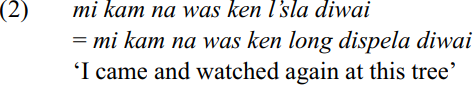 Cliticisation of aspect particles save (sa) ‘habitual’ and laik (la) ‘about to’ also appears to be in progress. Reduction can often be quite drastic, for example, the three-syllable utterance tso l’ sla taim recorded in the Highlands represents tasol long dispela taim ‘but at this time’ (maximally of seven syllables).