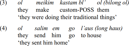 One effect is the cliticisation of certain words such as long ‘in; on; at’ and bilong (possessive), especially when preceding vowels: