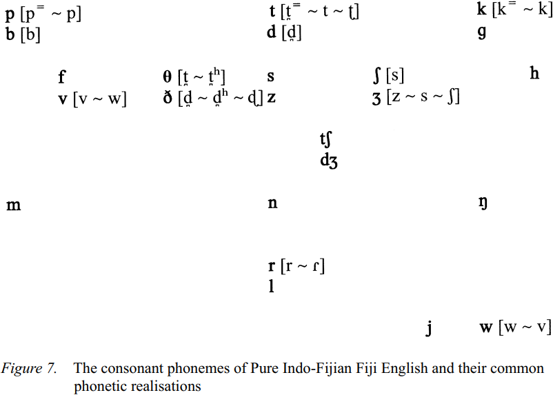 The consonant phonemes of Pure Indo-Fijian Fiji English and their most common phonetic realizations are shown in Figure 7.
