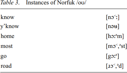 With the exception of the outlier (y’know), the formant trajectories for the off-glide in the diphthongs have a forward movement. This diphthong is quite a distinctive marker of Norfuk accent. However, it does not appear to be phonologically contrastive with Norfuk [ɔ:].