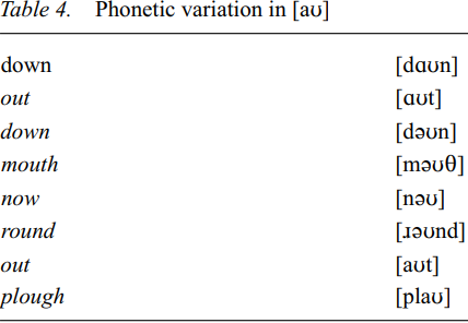To quantify this variation, we took formant measurements of the nucleus. The degree of lowering of the nucleus in the F1-F2 space corresponded with impressionistic transcription. Clearly, the word plough seems to be a borrowing from Australian English.