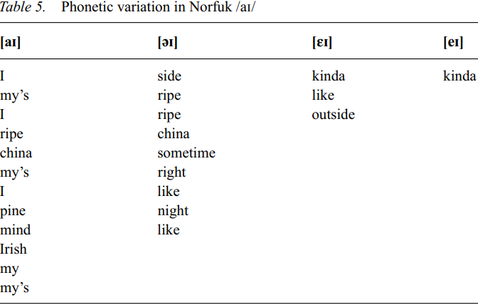 Norfuk [ɑɪ] evinces incomplete lowering of the nucleus, as also found in conservative regional English dialects. The environment for this incomplete lowering (often referred to as ‘Canadian Raising’ for its prevalence in Eastern Canadian English) is before voiceless obstruents in closed syllables. Our impressionistic transcriptions of [ɑɪ] tokens in stressed syllables showed some evidence of this rule in Norfuk.