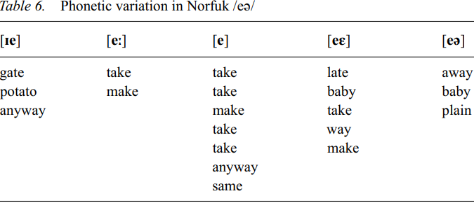 Norfuk [eə] (which corresponds to Australian or Standard Norfolk English [eɪ]) is either a monophthong or an opening diphthong which is highly recognizable (as it is in Irish English). The range of variation illustrated in Table 6 is quite large, as the following tokens suggest. There was no obvious phonological conditioning for this variation.