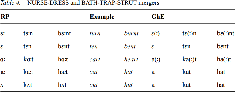 There are two other vowel mergers that often result in GhE homophony. These result from a fusion of RP /з:/-/ε/ and /ɑ:/-/æ/- /Λ/ , vowels not primarily distinguished by degree of openness (laxness). However, RP length differences are more regularly – though not categorically – maintained here: