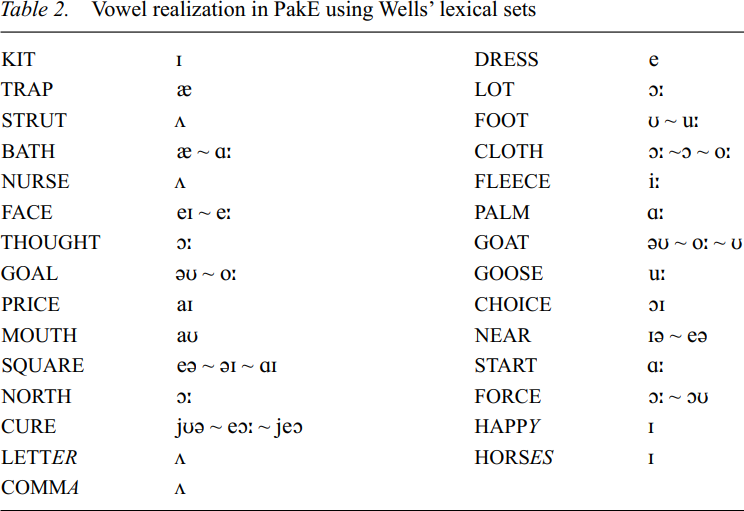 At present, there are no detailed studies of the phonology of PakE. This paper therefore attempts to present a preliminary description of PakE phonology based on data collected in Karachi in the summer of 2002. Language samples presented and analyzed in this paper (unless otherwise stated) were collected from six educated Pakistanis between the ages of 22 and 37. Four of these participants were female and two were male. All of the participants were native speakers of Urdu. Language samples were first elicited using the Sheffield word-list (Foulkes and Docherty 1999) and then the ‘North Wind’ reading passage.