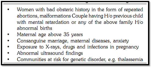 Any couple with a child or a family member with a genetic problem or a history of congenital defect will be keen to know more about the disorder, the risk of recurrence of the disorder, and remedial measures if any (Table.1). The aim of the genetic counsellor is to provide these individuals seeking information with an understanding of the disease in question and its implications, as well as the options available. A good counseling process helps families with their problems, allows informed decision-making, reduces possible anguish and is a step towards the final adjustment in dealing with the disorder.