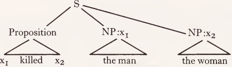 If one accepts the position (expounded and defended in e.g. McCawley 1968 a) that each noun phrase occurrence in a syntactic representation must have attached to it an ‘index’, which corresponds to the ‘intended reference’ of that noun phrase occurrence, then the structure which underlies (15) will have to have some index X1 attached to the man and some index x2 attached to the woman. The meaning of (15) will then involve the assertion that x1 participated as agent and x2 as patient in a certain event y of killing, the assertion that y took place prior to the speech act, and the assertions that x± is a man and that x2 is a woman. One might propose that the semantic representation of (15) is obtained simply by conjoining all these assertions, with perhaps some additional terms to cover the meaning of the, which I have ignored:
