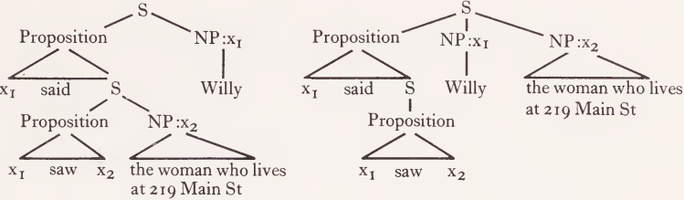 The hypothesis that English sentences are derived from semantic representations of the form proposed above entails the conclusion that English has a transformation which attaches each noun phrase to an occurrence of the corresponding index. In the proposed underlying structure of (19), this transformation would attach the woman who lives at 219 Main St to the single occurrence of x2 and Willy to the first of the two occurrences of x1. In this case only the first occurrence of x1 is a possible place to attach Willy: note that in