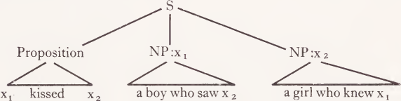 Here her is to be interpreted as referring to the girl mentioned in the sentence and him referring to the boy. Under the conception of pronominalization which derives a pronoun from a copy of its antecedent, her would have to come from a copy of a girl who knew a boy who saw her, which would in turn have to come from a copy of a girl who knew a boy who saw a girl who knew him, etc., and each of the two noun phrases would have to be derived from an infinitely deep pile of relative clauses. However, under the conception of pronominalization which I propose, this anomaly would vanish. (34) would be derivable from a structure roughly representable as The attachment of noun phrases to index occurrences takes place sequentially.