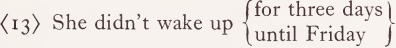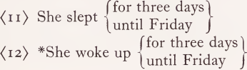 Some verbs refer to activities viewed as necessarily changing in time, others do not; this contrast is frequently referred to with the terms ‘ momentary ’ and ‘ continuative ’ respectively. Sleep is a continuative verb, wake up is a momentary verb. A continuing activity, or state, necessarily occupies a span of time, and thus it makes sense to qualify a continuative verb with a complement which identifies one or both of the end-points of such a span, or a distance-measure of the span. Thus while the sentences in (n) make sense, those in (12) do not: