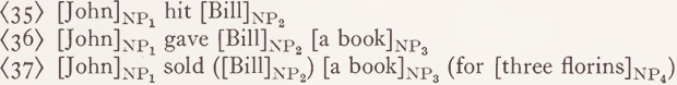 It is obvious from the foregoing discussion that the number of arguments of a predicative feature must be somehow connected to the number of NPs required by the lexical entry whose reading contains that feature. Thus the verbs ‘hit’ and ‘give’, for example, are often considered as expressing two- and three-place relations, respectively, ‘ buy ’ and ‘ sell ’ on the other hand as expressing relations with two, or three, or even four arguments: