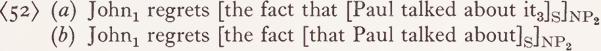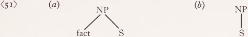 This assumption, motivated by several syntactic phenomena, suggests that the noun ‘fact’ of (51 a) has semantically the effect of deriving the fact name corresponding to the proposition expressed by S. In other words, the reading of ‘the fact’ in one of its meanings has the form ‘(Def Xi) ([P]Xi)’ where P is a variable over propositions to be substituted by the reading of the complement sentence and i is the reference index of the dominating NP-node. This seems to me a fairly reasonable account of the semantic connection between ‘the fact’ and its attributive clause in (52 a), which is unlike that of the restrictive clause to ‘the fact’ in
