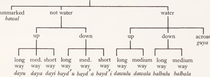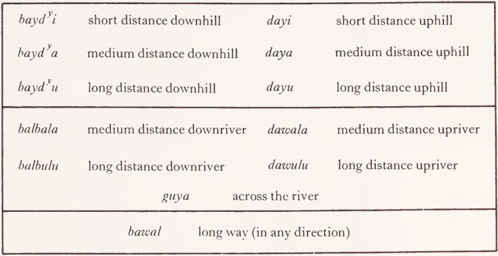 (Dyirbal is spoken in the Rain Forest just south of Cairns, in the hilly, well- watered area between the east coast and the dividing range; hence the rich set of terms for referring to ‘ up ’, ‘ down ’, with respect to ‘ river ’, ‘ hill ’, etc.)