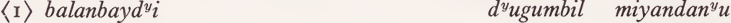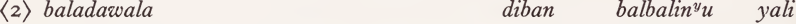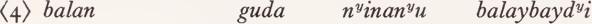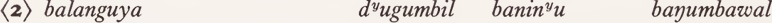 where dandu corresponds to Guwal yugu ‘ tree, stick ’ and dyuyi to Guwal gamin ‘ loya vine ’. In the case of bilinyu, dayubin is qualified by dandu in locative inflection (i.e. ‘climb [at] a tree’); for bumiranyu, dyuyibila ‘with a gamin' is specified as qualification of the subject of the verb.