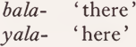 and the second element is a locational case morpheme: -ru ‘to (with respect to a place)’, -ri ‘to (with respect to a direction)’, -ŋum ‘from’, or -y ‘at’. Allative (-ru, -ri) and ablative (-ŋum) forms are usually shortened by the deletion of the -la- of bala- or yala-, the -r- of the allative inflections being simultaneously changed to -l-: thus balu, bali, baŋum but balay. A verb marker may optionally be followed by one of the twelve bound forms in the table above. Thus: