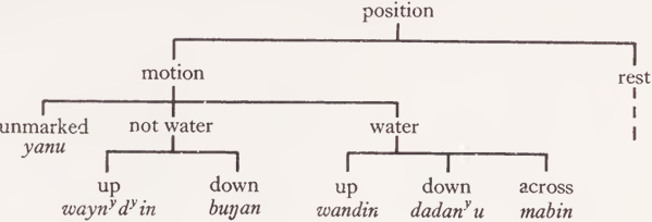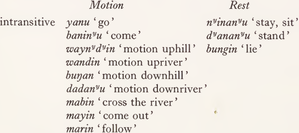 The fact that simple verbs concerned with position3 fall into two classes, ‘ motion ’ and ‘ rest suggests that the semantic descriptions of these verbs should be taken to include the appropriate feature: ‘motion’ or ‘rest’. From this and the Dyalŋuy data we can generate semantic descriptions: